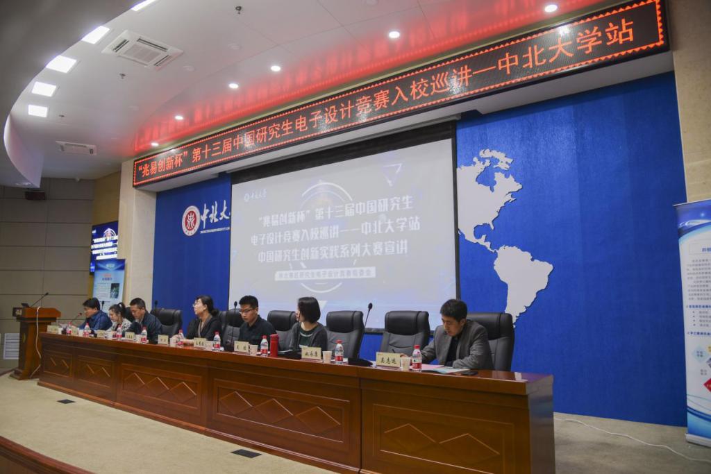 4月23日下午,中国研究生创新实践系列大赛宣讲会暨“兆易创新杯”第十三届中国研究生电子设计竞赛入校巡讲——中北大学站在瑾瑜国际会议中心举行。中国研究生电子设计竞赛组委会秘书王慧君、中国研究生电子设计竞赛企业命题代表兼中国梦之墨科技有限公司技术市场经理吴聪、研发总监汪海波、大区经理肖阳春、应用工程师姚勇康、西北地区合作伙伴张发海和谢志敏、我校研究生党委书记何华、副院长吴志远、信息与通信工程学院兼华北赛区研究生电子设计竞赛组委会专家组长王黎明莅临了本场宣讲会。宣讲会由研究生党委副书记兼副院长崔亚主持。
