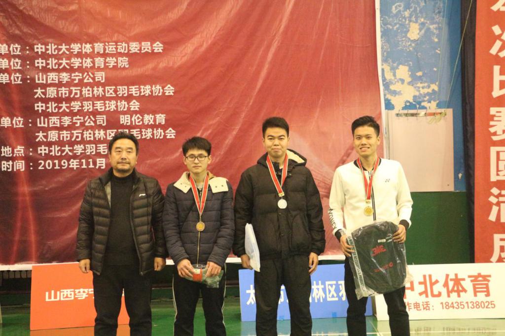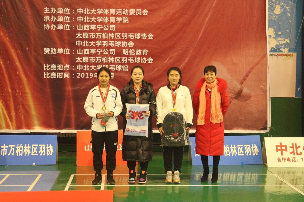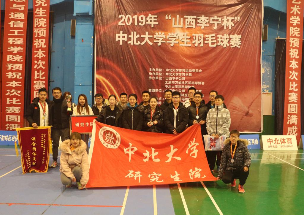 比赛结束后,太原市万柏林区羽毛球协会主席王彩虹女士及山西李宁公司总经理高龙为获奖队伍及选手颁奖,我院研究生张旭获得单项男子羽毛球赛冠军,赵瑞雪获得单项女子羽毛球赛亚军,研究生院羽毛球队获得混合团体羽毛球赛亚军。