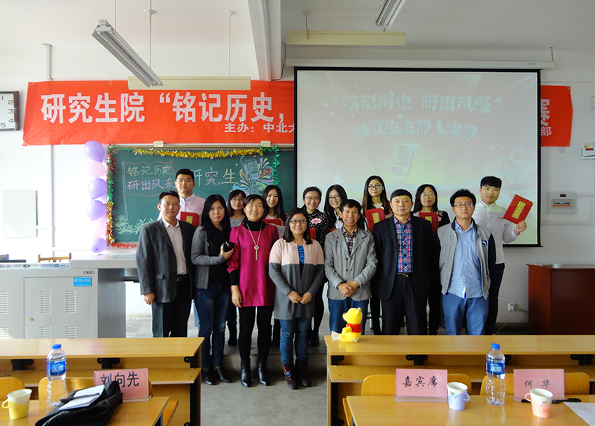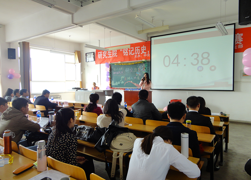 2015年10月17日上午8:30,中北大学研究生院主办的“铭记历史 研出风采”主持人大赛的决赛在14302教室拉开帷幕。担任本次大赛的评委有人文社会科学学院副院长王爱成、校工会办公室主任王通、人文社会科学学院思想管理部刘向先、人文社会科学学院新闻与传播专业黄晴、研究生院学籍管理科科长郭艳丽。除此之外,研究生院党总支书记何华、教育管理科学生活动主管老师殷勍作为嘉宾也出席了本次大赛。
