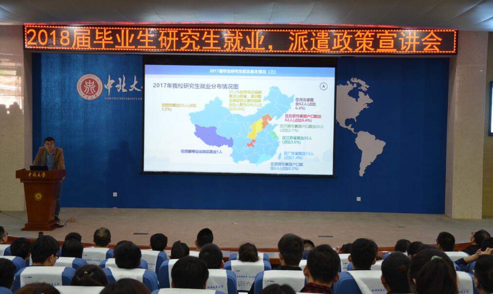 2018年4月23日上午,由中北大学研究生院主办的“2018届毕业研究生就业、派遣政策宣讲会”在瑾瑜国际会议中心成功举办。本次宣讲会由研究生院就业主管任伟吉老师主讲,吸引了我校数百名2018届毕业研究生参加。