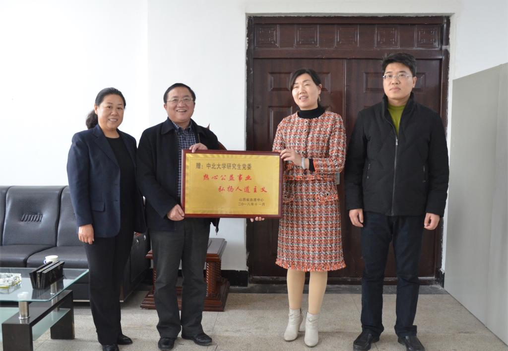 2018年11月29日,山西省血液中心主任白林、献血服务二科主任徐素霞一行专程向我院赠送“热心公益事业,弘扬人道主义”牌匾,以赞扬研究生院组织的公益献血活动,中北大学研究生党委书记何华、党委副书记兼副院长崔亚进行了热情接待。
