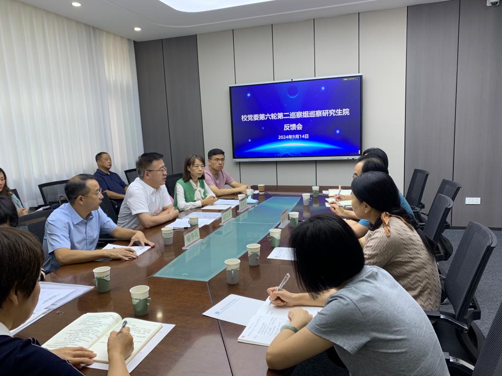 杨秋翔代表研究生院全体人员作表态发言。他表示研究生院针对巡察组反馈的巡察意见,诚恳接受、照单全收并坚决抓好整改。一是提高政治站位,以高度的责任感推动巡察整改,整改不到位不放过,坚决把“后半篇文章”做深做实。二是强化政治责任,锤炼政治担当,全力整改巡察发现的问题,始终以最严肃的态度、最务实的作风、最坚定的信念,聚焦病灶,对症下药,确保全部整改到位。三是主动作为、措施有力,确保巡察反馈问题整改取得实效,坚持自觉把巡察结果与日常工作融为一体,把解决问题和促进发展结合起来,正确把握政治和业务的关系,在整改中增强党性,严肃纪律,立好规矩,推动发展。